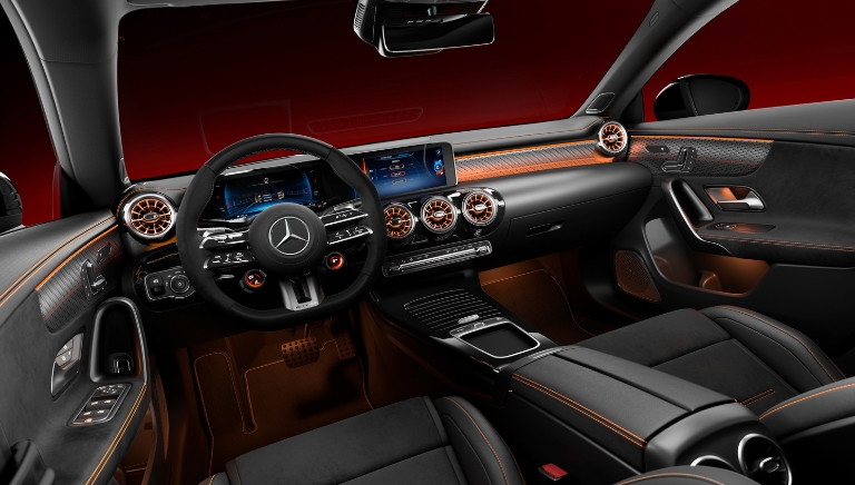 La estética dinámica y deportiva de la carrocería encuentra su continuación en el interior. Los asientos deportivos con tapizado en símil de cuero con microfibra armonizan a la perfección con el volante AMG Performance. La consola central táctil de diseño específico irradia deportividad, la iluminación de ambiente de 64 colores crea un ambiente envolvente. El puesto de conducción widescreen está compuesto por pantallas de instrumentos y de medios completamente digitales y de 10.25 pulgadas cada una.