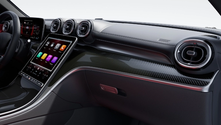 El concepto de manejo y visualizado altamente digitalizado está garantizado. El gran visualizador central responde a las entradas táctiles. Gracias al asistente de voz MBUX podrás controlar muchas funciones de infoentretenimiento. Además, las molduras AMG en fibra de carbono combinan de manera perfecta con el tablero de instrumentos.