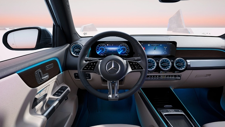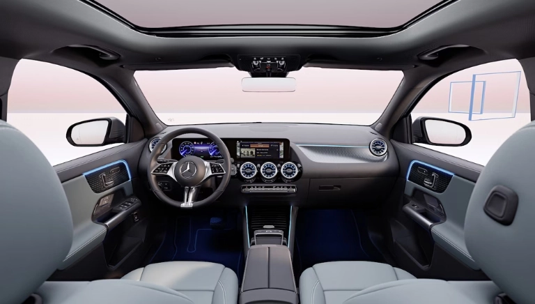 El interior del EQA es una lograda síntesis entre un auto deportivo, espacio y de alta tecnología. Cada rincón del EQA presenta un lenguaje formal fresco, altamente tecnificado y futurista gracias al sunroof panorámico, las molduras retroiluminadas y la iluminación de ambiente de 64 colores.