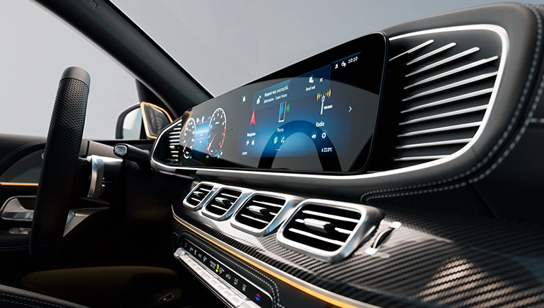 Con el puesto de conducción widescreen, la GLS se sitúa a la vanguardia también en materia de digitalización. El visualizador del cuadro de instrumentos y el visualizador de medios de 12,3 pulgadas cada uno, conforman una unidad óptica en el puesto de conducción. Las dos pantallas en color, íntegramente digitales, están unidas bajo una misma tapa de cristal formando una superficie continua y armoniosa. Además podrás conectar tu teléfono móvil de forma inalámbrica al sistema multimedia MBUX mediante Android Auto™ o Apple CarPlay™.