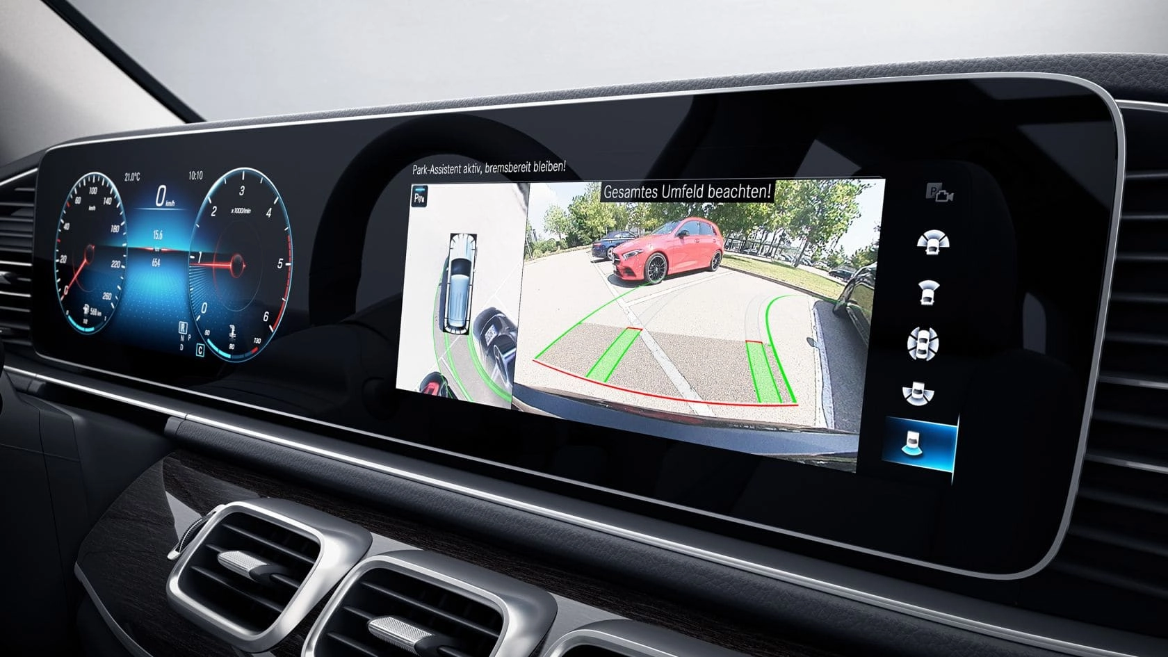 Servicio ideal de aparcamiento a bordo. La ayuda activa para aparcar con cámara de 360° te facilita tanto la búsqueda de estacionamiento como la maniobra de aparcar y desaparcar. La elección está en tus manos: aparcar con soltura gracias a la ayuda de la visión omnidireccional, o relajarte y dejar que el vehículo aparque por sí mismo, incluye una representación virtual desde una perspectiva a vista de pájaro.
